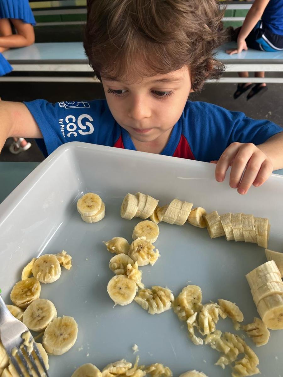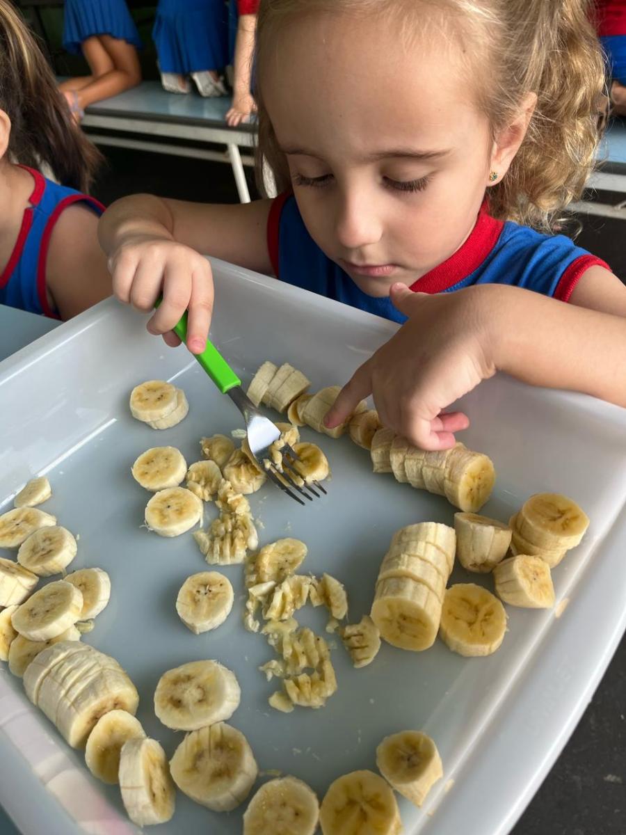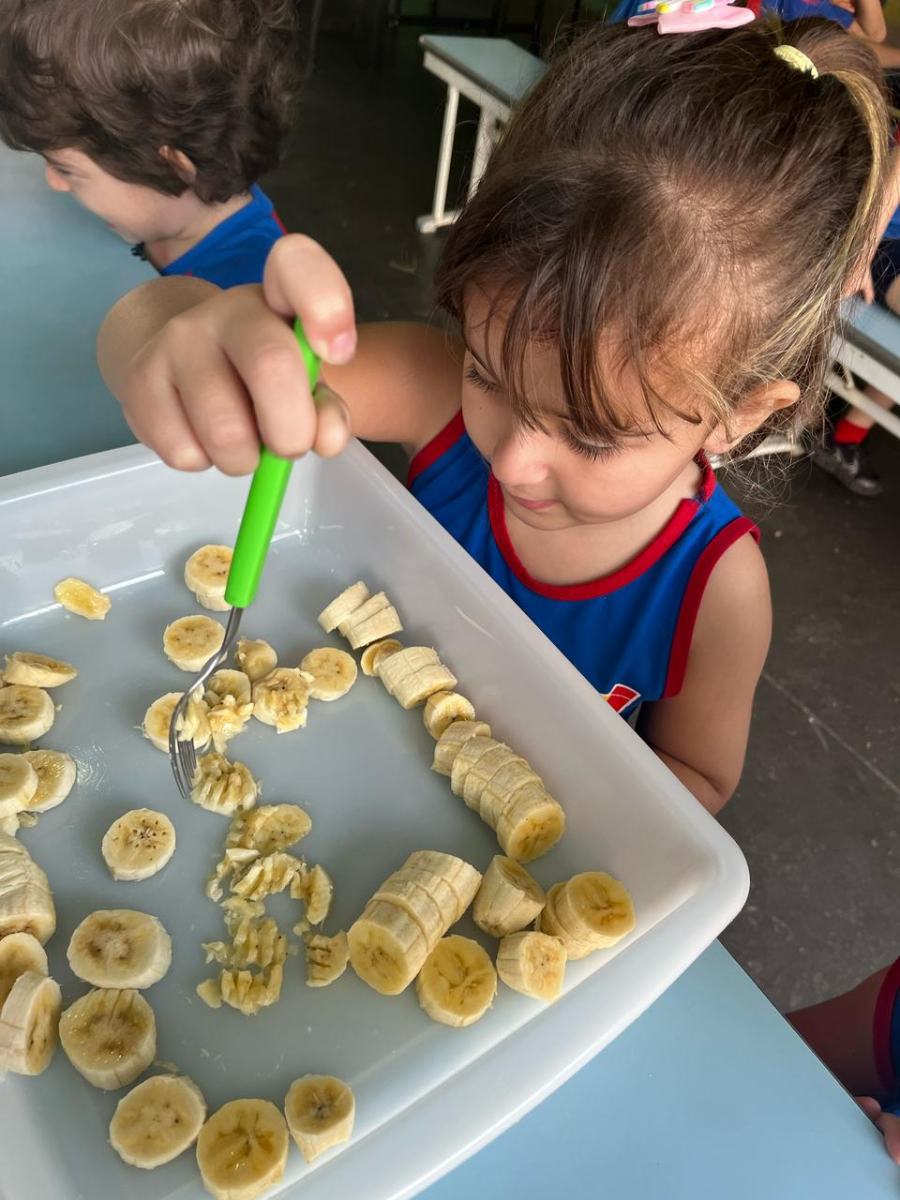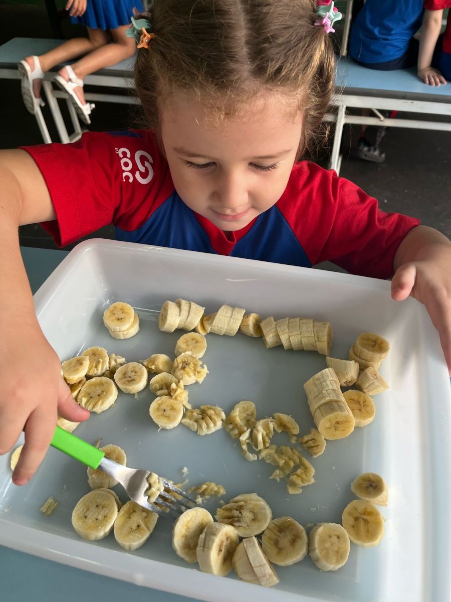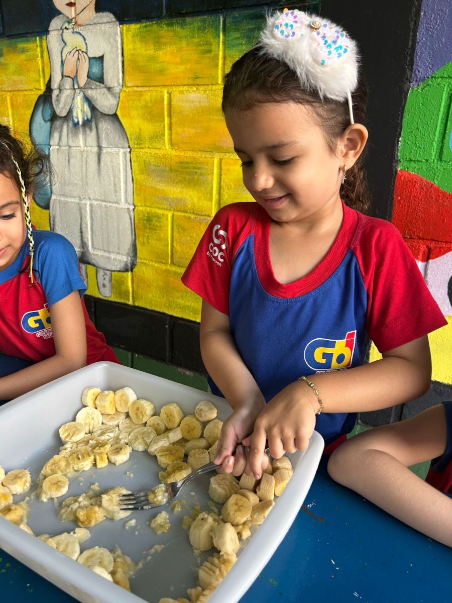 Durante a semana aprenderam sobre a escrita dos nomes das frutas, fizeram atividades de recorte e colagem e para a aula ficar ainda mais saborosa nada melhor que uma deliciosa culinária proposta pelo livro COC: Banana com Aveia e Mel.