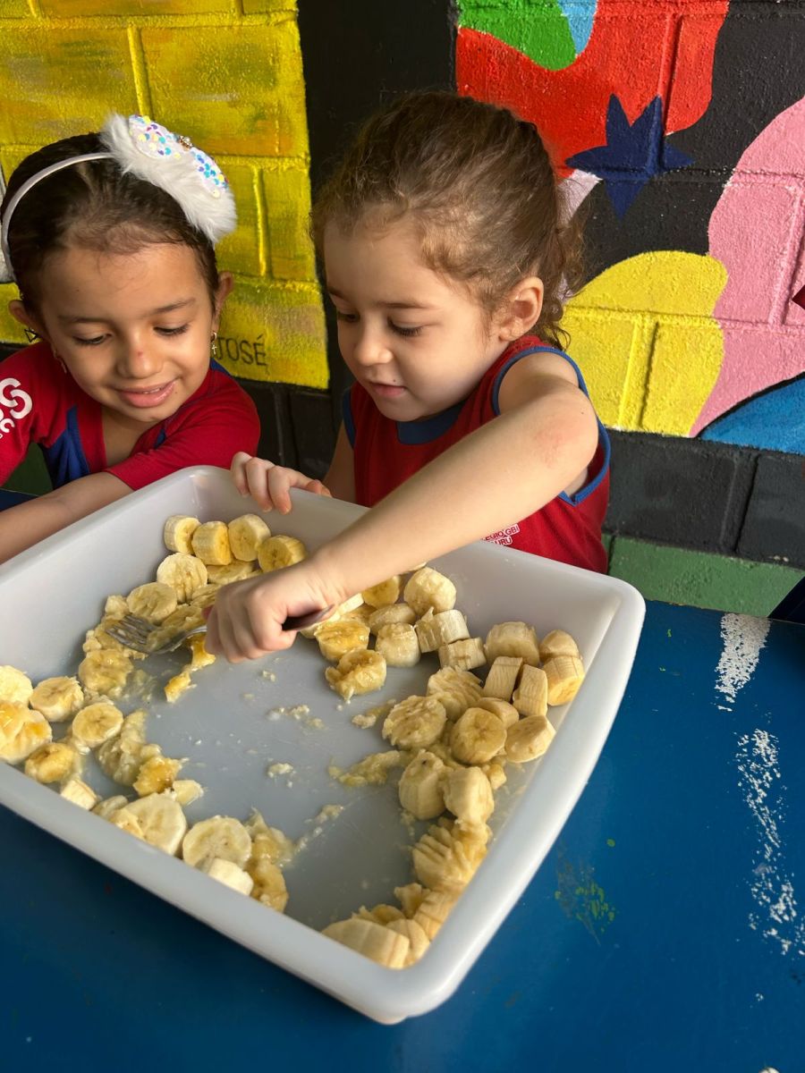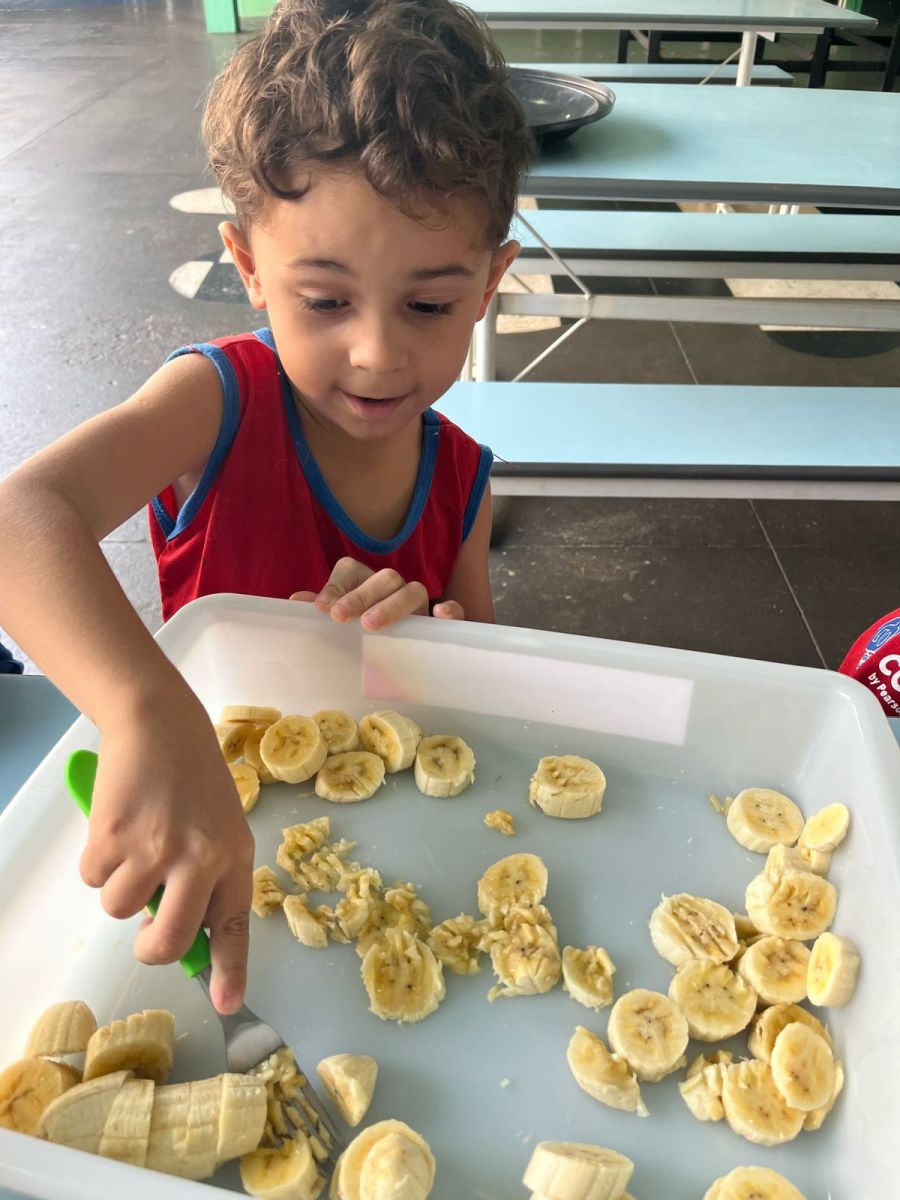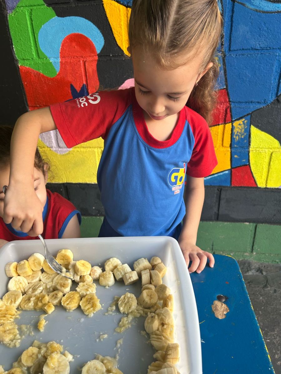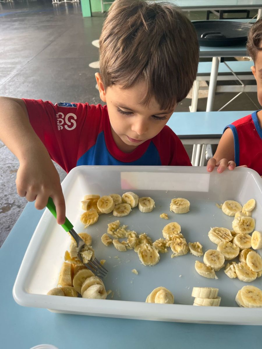 Durante a semana aprenderam sobre a escrita dos nomes das frutas, fizeram atividades de recorte e colagem e para a aula ficar ainda mais saborosa nada melhor que uma deliciosa culinária proposta pelo livro COC: Banana com Aveia e Mel.