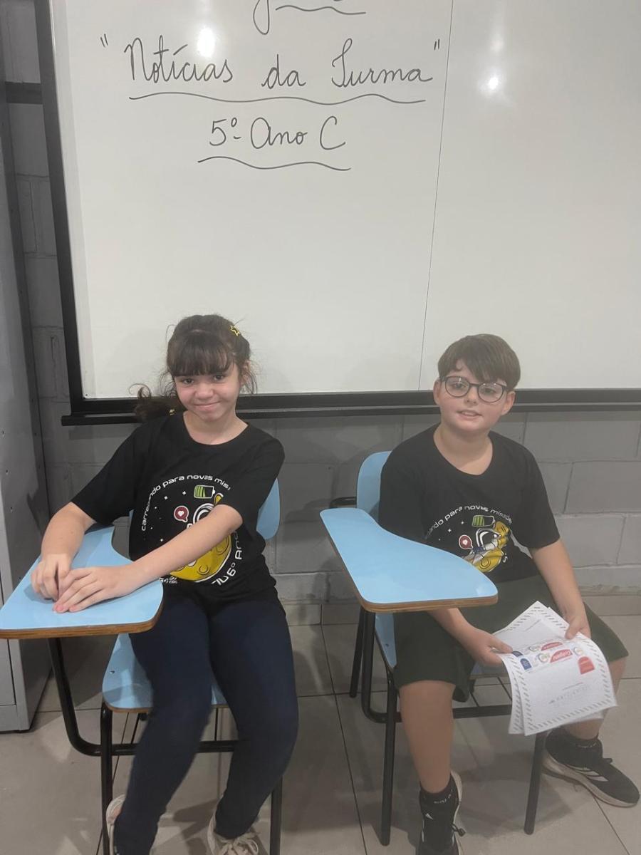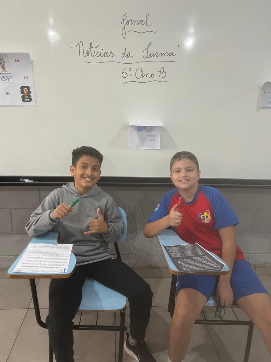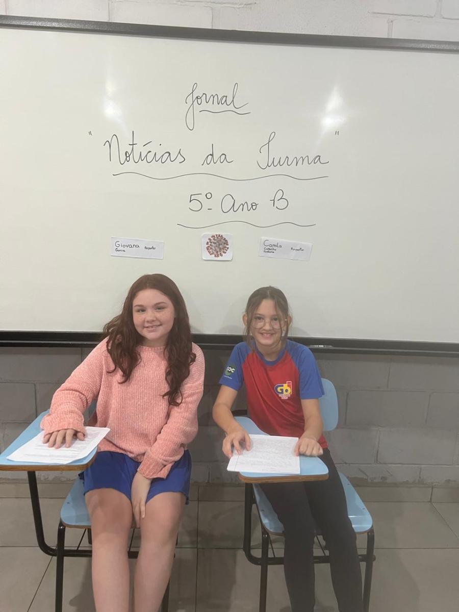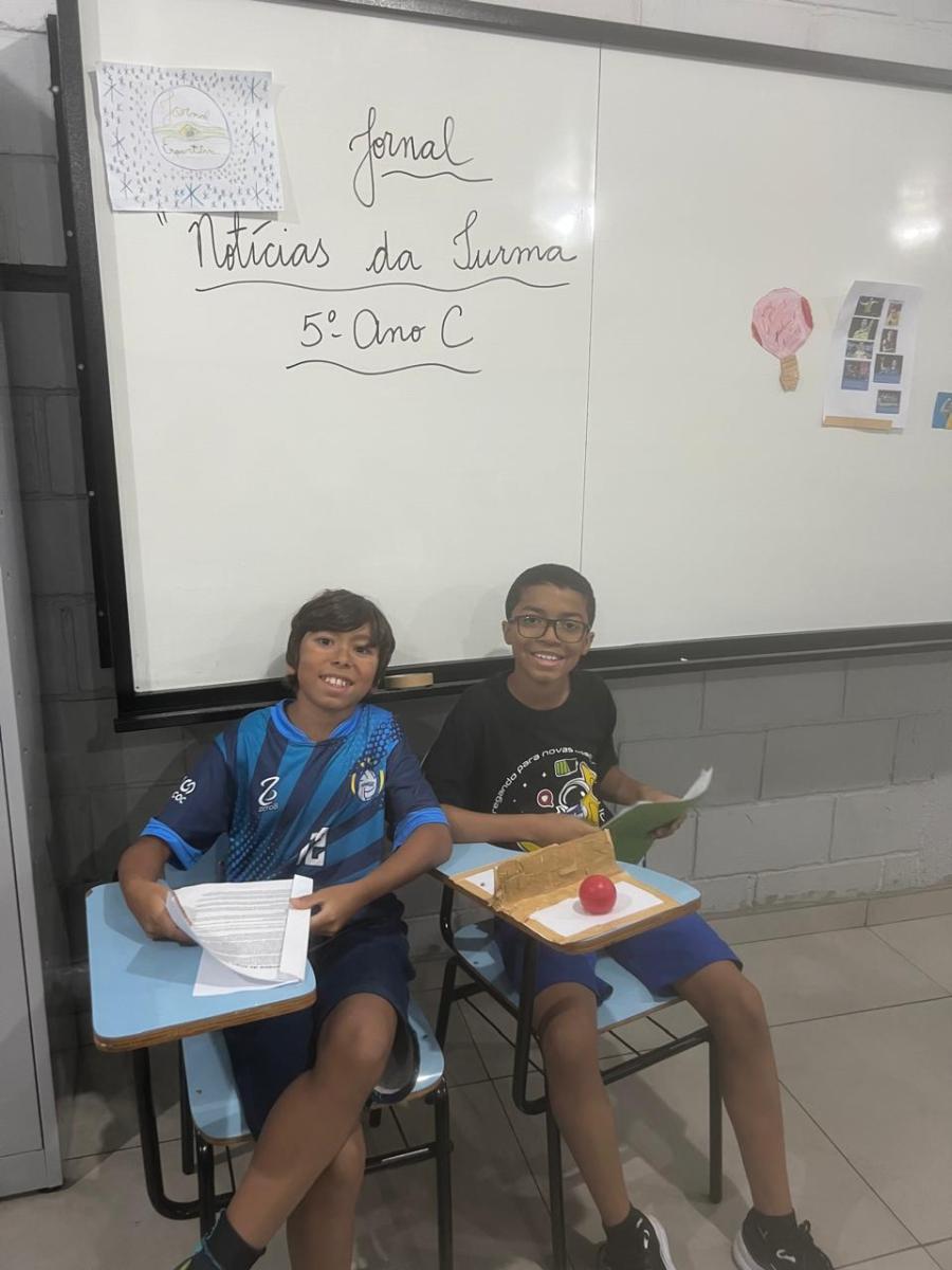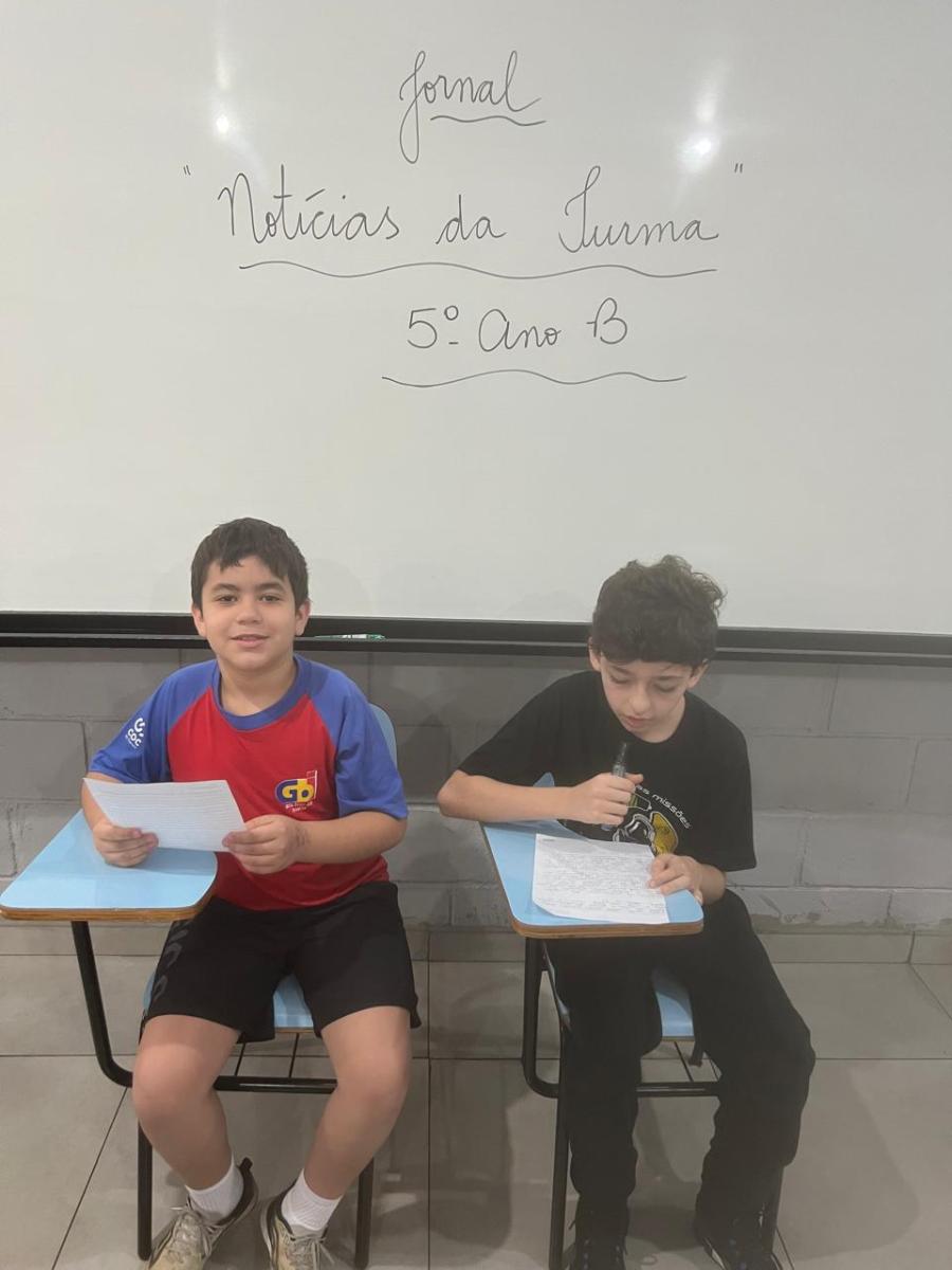 “Oi, pessoal! Hoje a galera dos 5ºAnos, A, B e C vão falar e apresentar um texto jornalístico.
