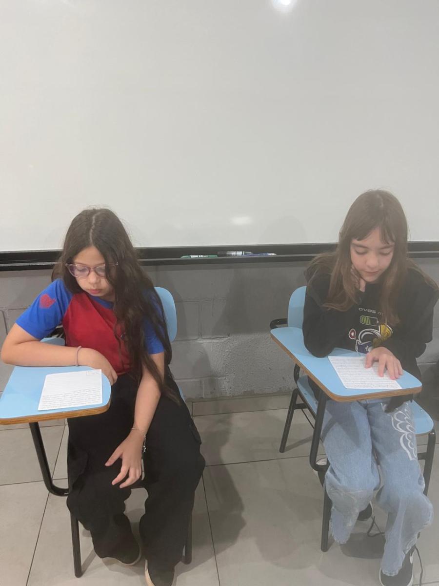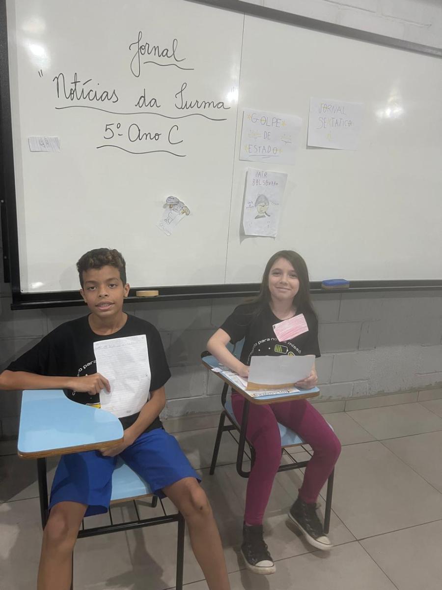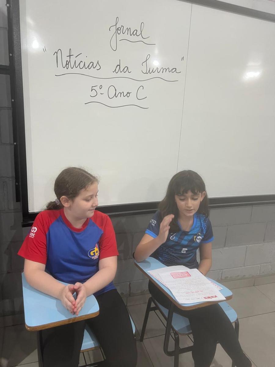 “Oi, pessoal! Hoje a galera dos 5ºAnos, A, B e C vão falar e apresentar um texto jornalístico.