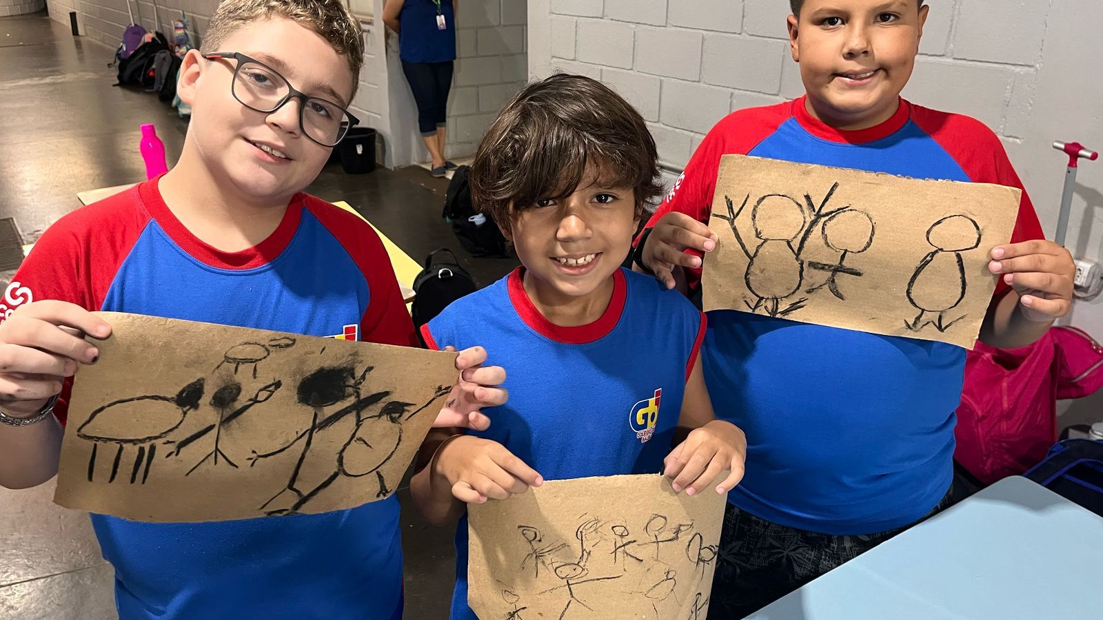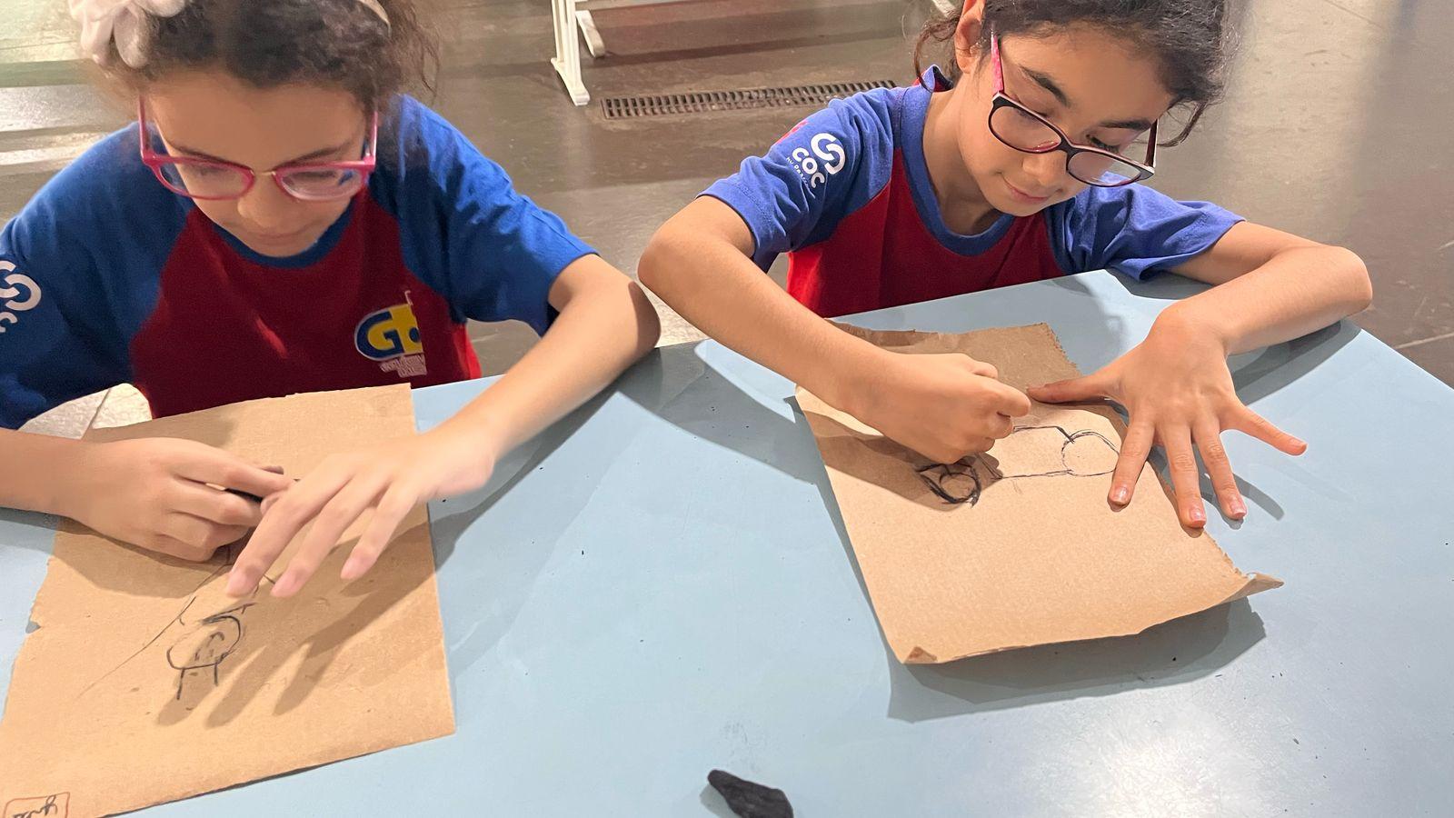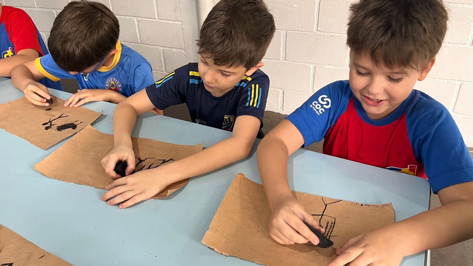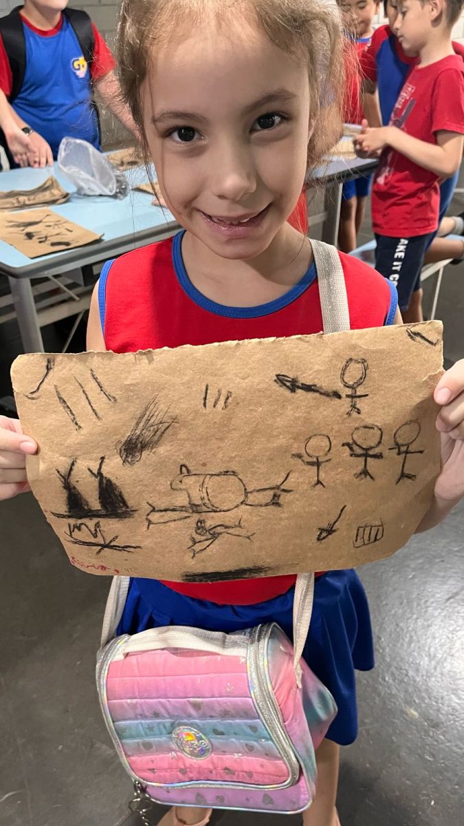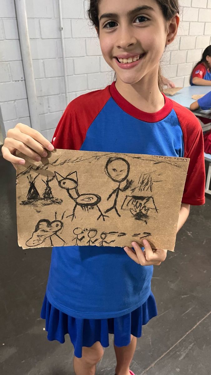 Como estudo da Pré-História, os alunos do 4 ano B e C fizeram ilustrações com carvão uma arte rupestre.