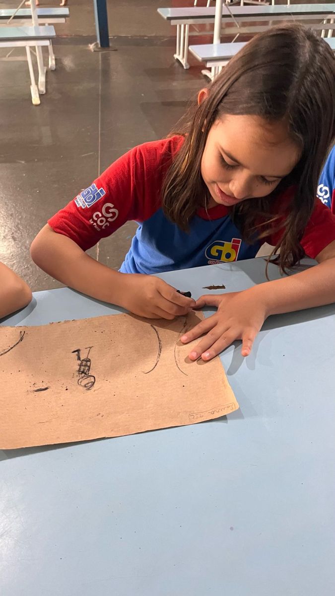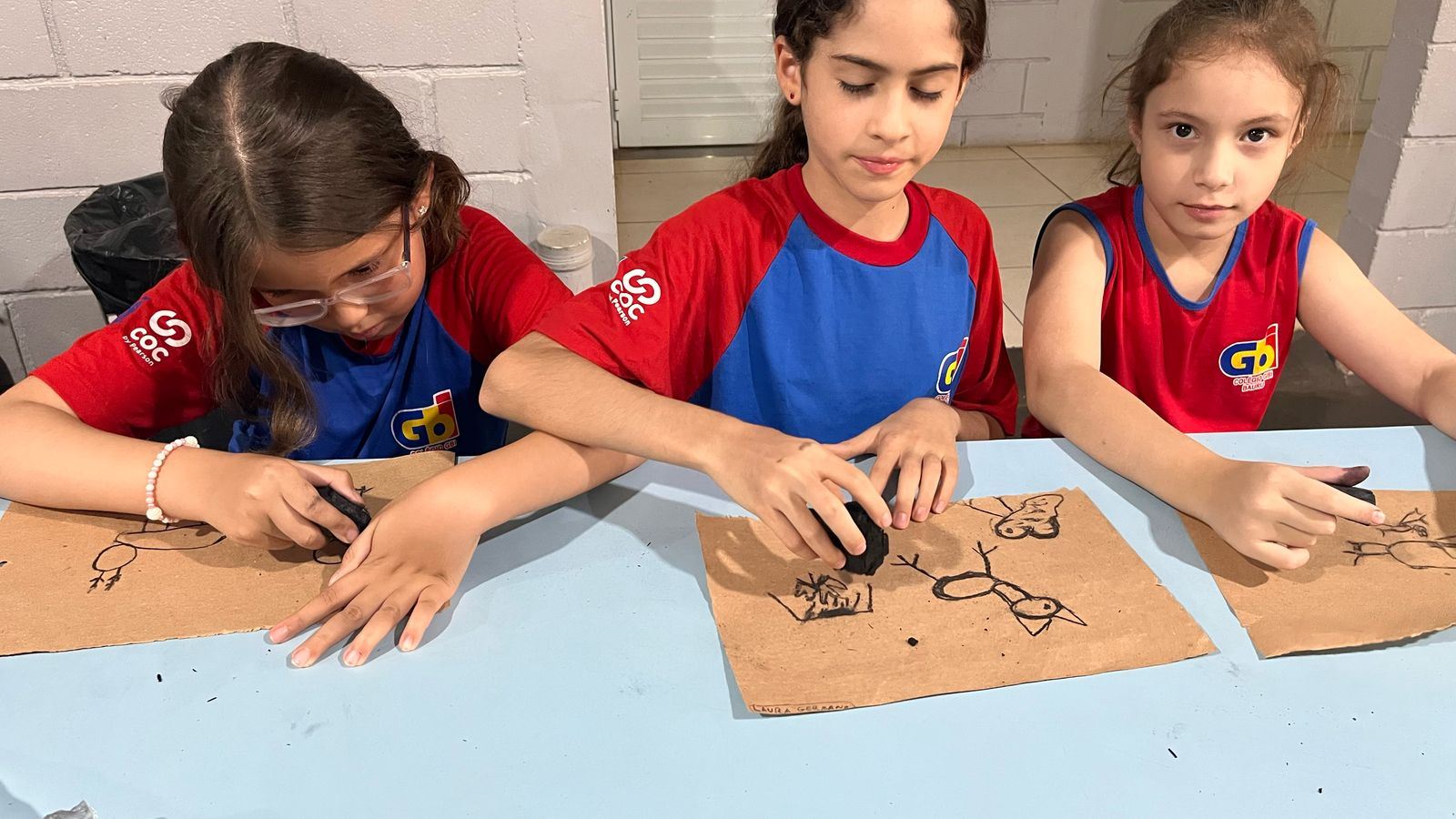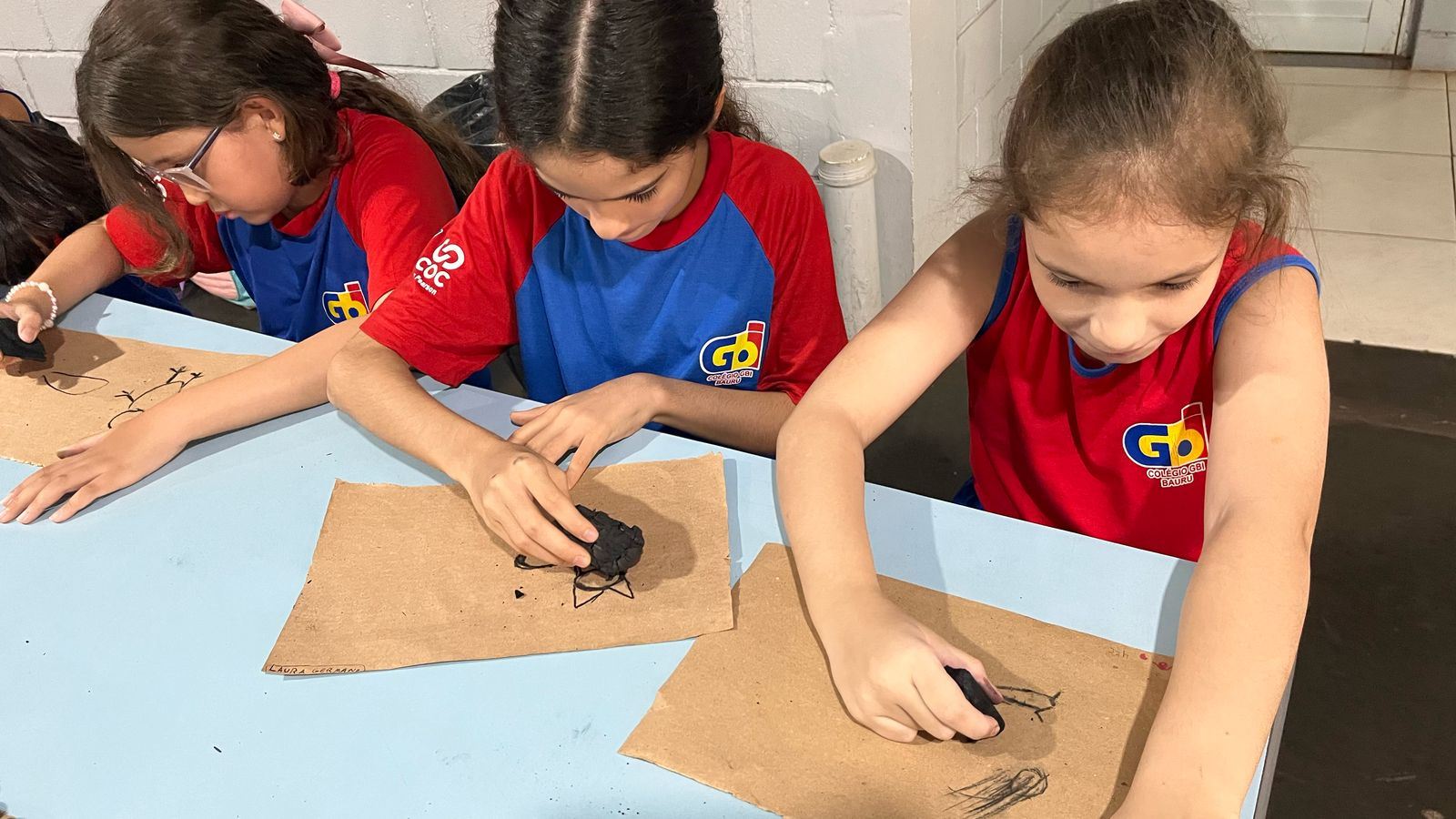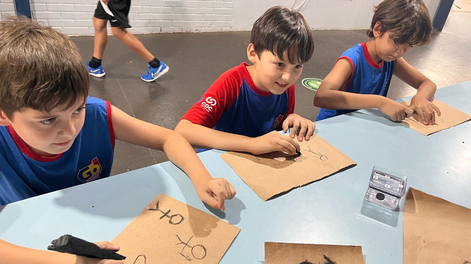 Como estudo da Pré-História, os alunos do 4 ano B e C fizeram ilustrações com carvão uma arte rupestre.