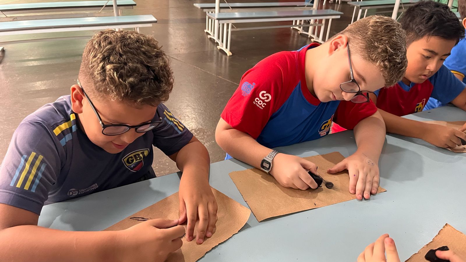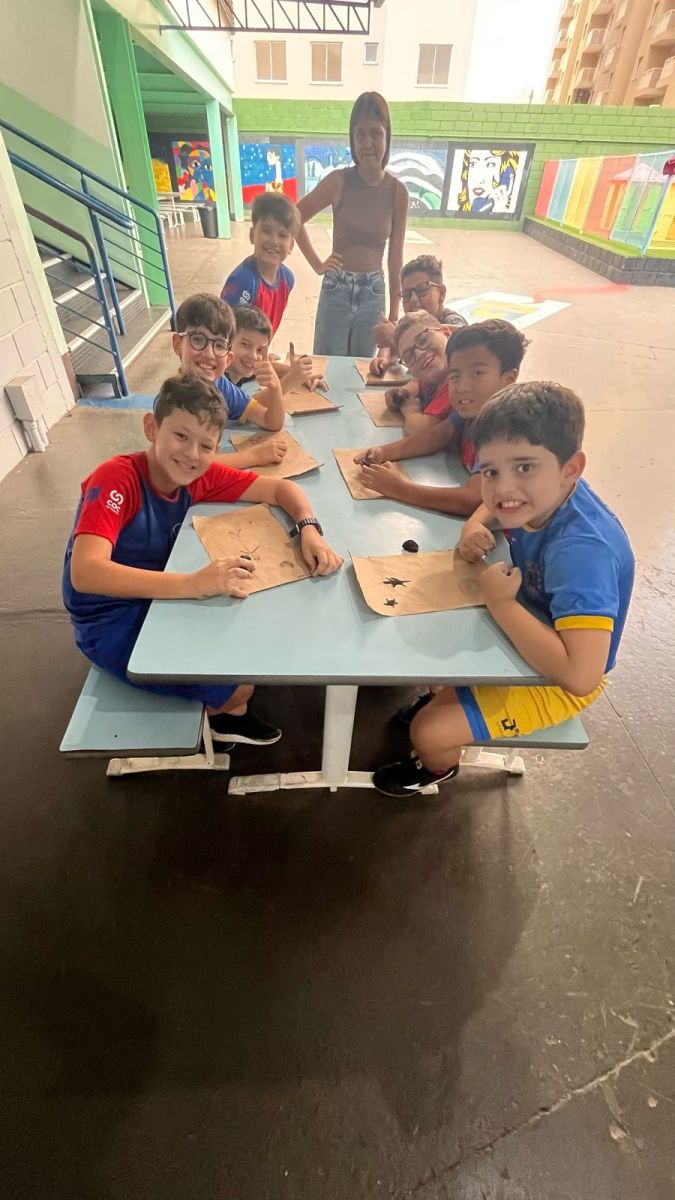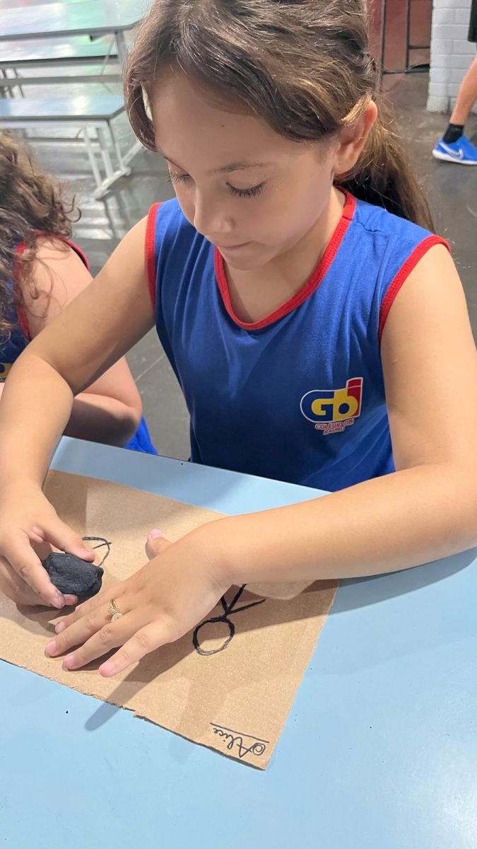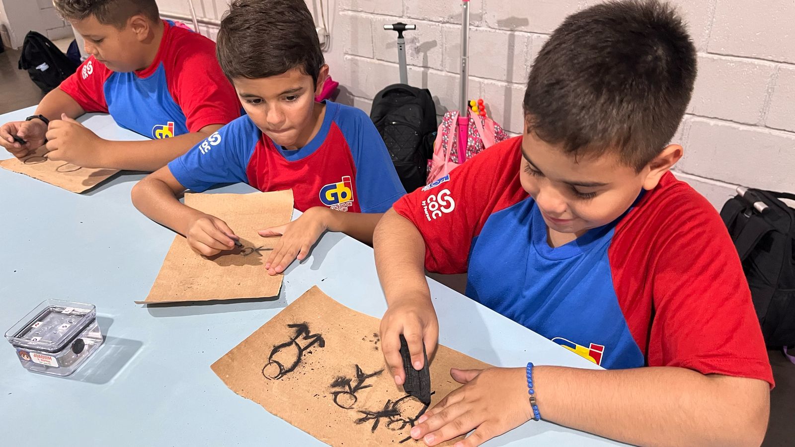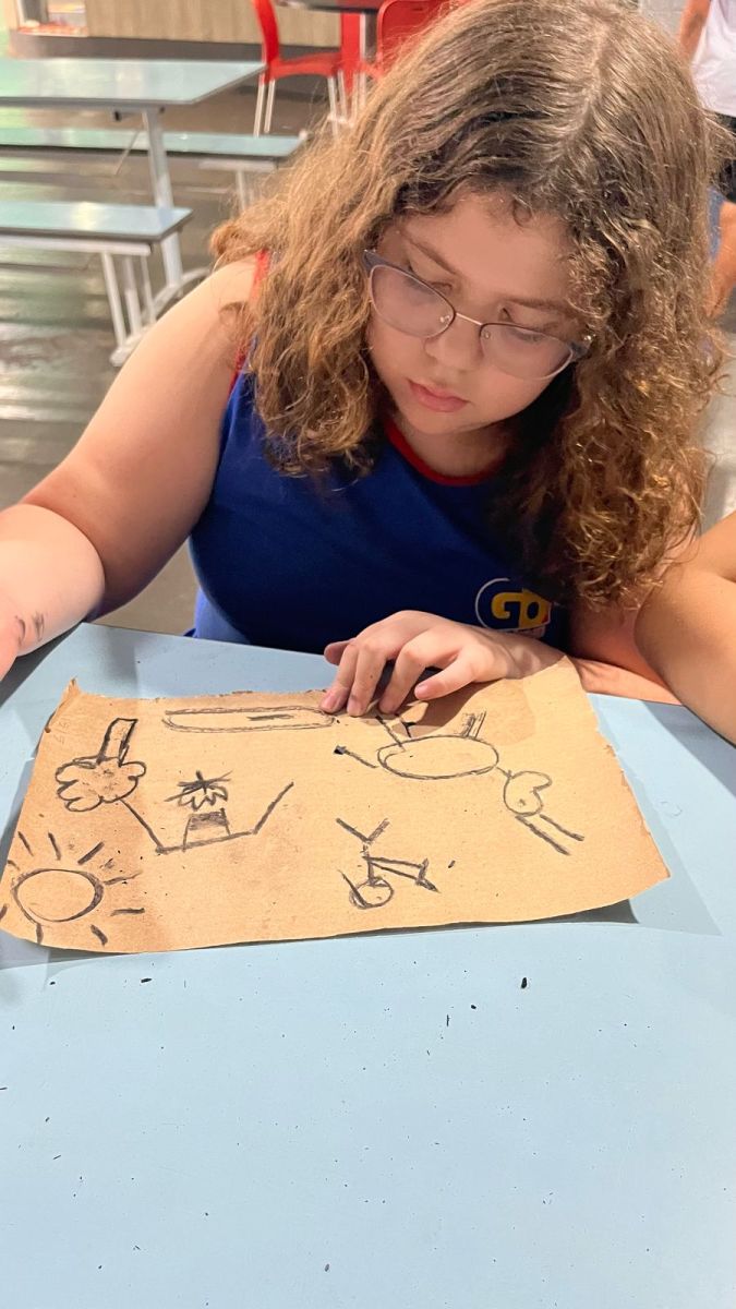 Como estudo da Pré-História, os alunos do 4 ano B e C fizeram ilustrações com carvão uma arte rupestre.