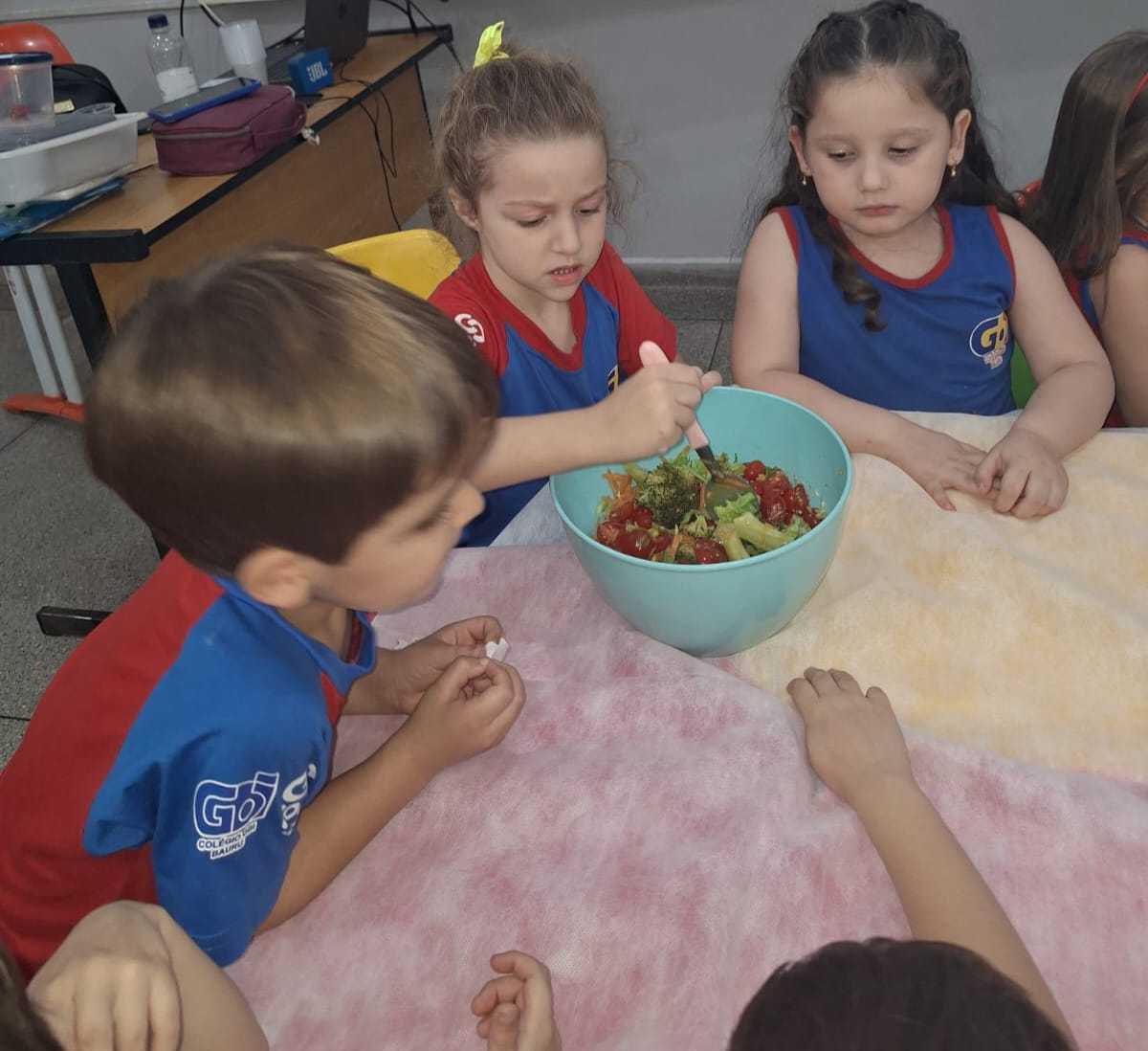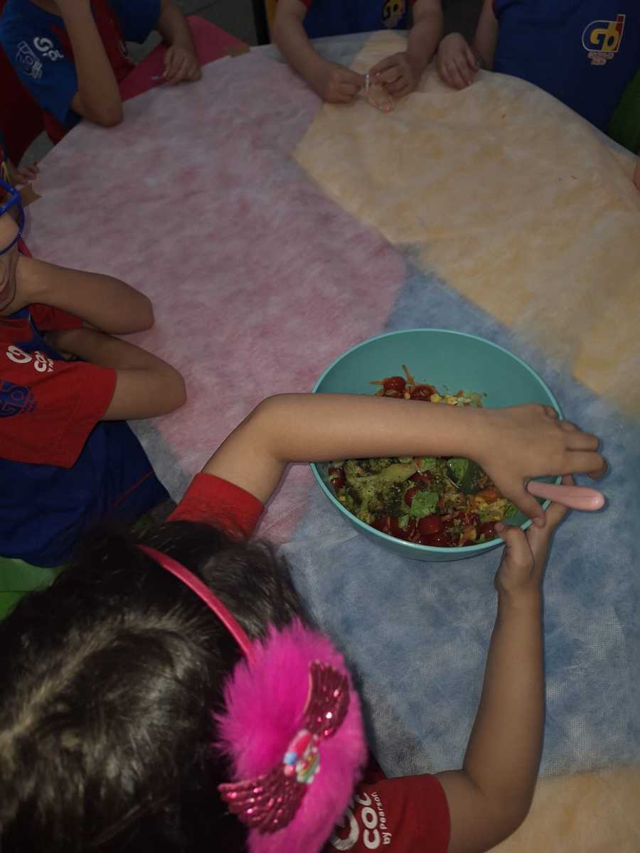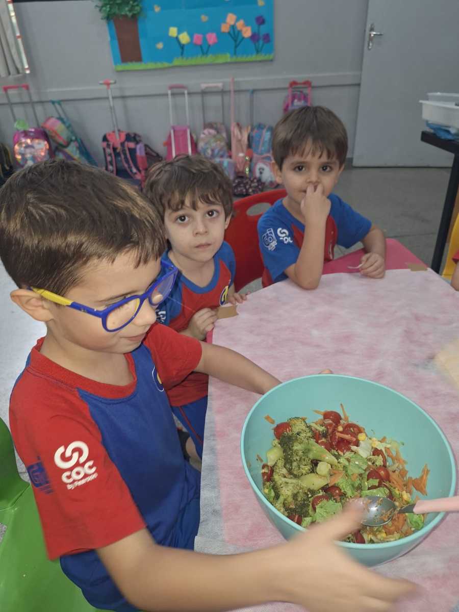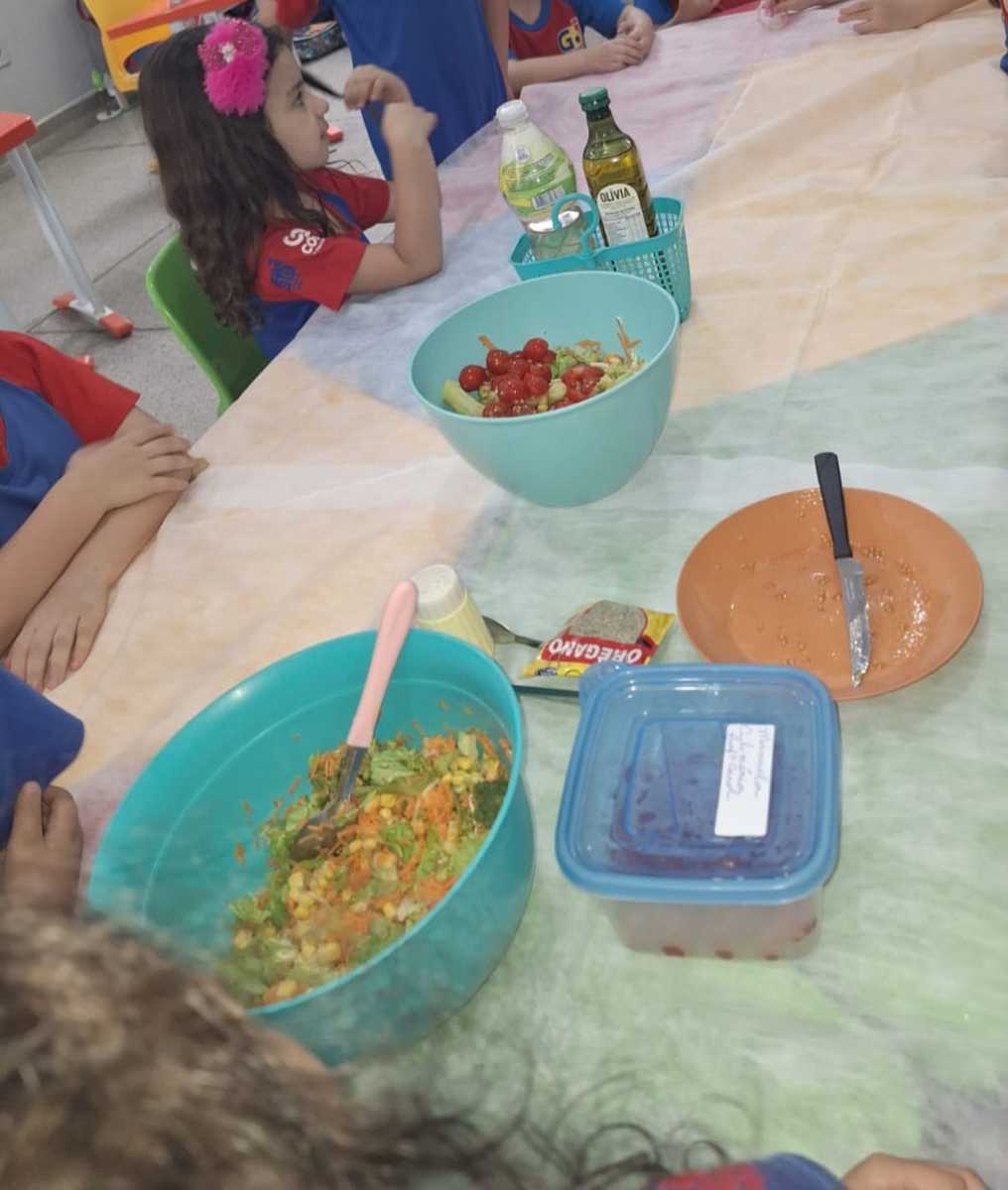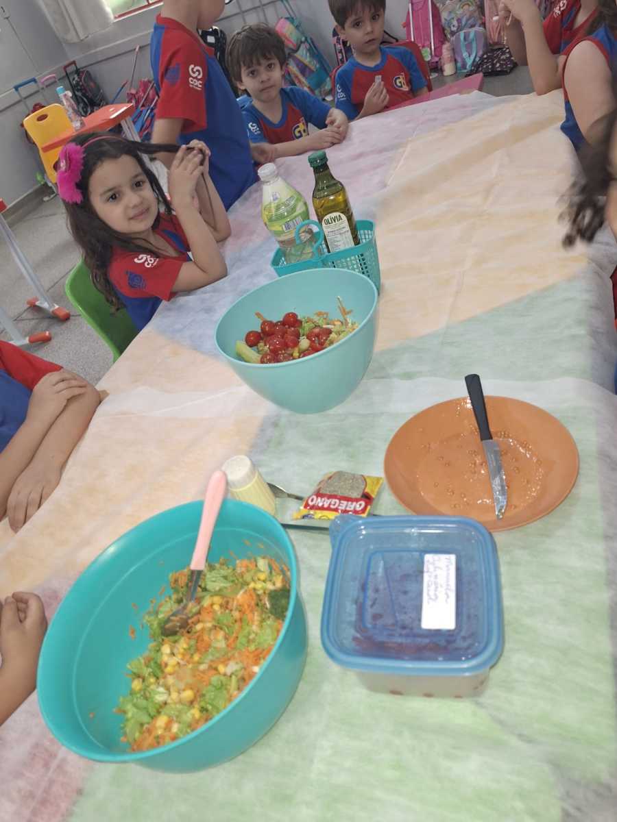 Foi uma explosão de cores e sabores, as crianças puderam observar, tocar e cheirar, misturamos todos os ingredientes em uma bacia (milho, alface, cenoura, brócolis e tomate cereja) acrescentamos orégano, azeite e sal e cada criança teve o seu momento de provar e saborear a nossa salada.