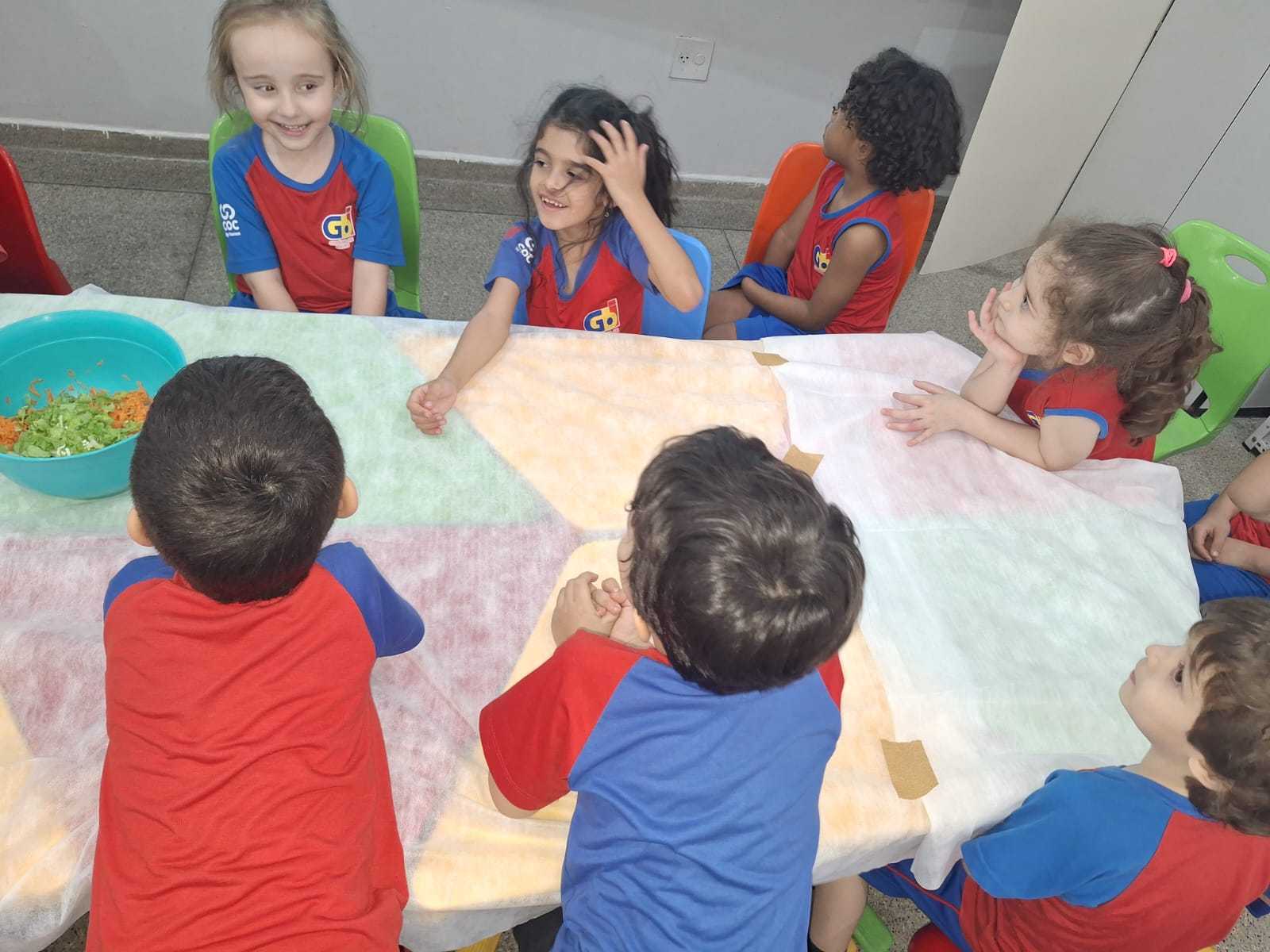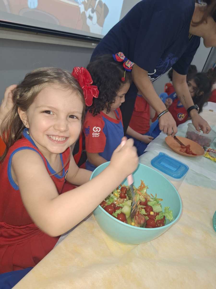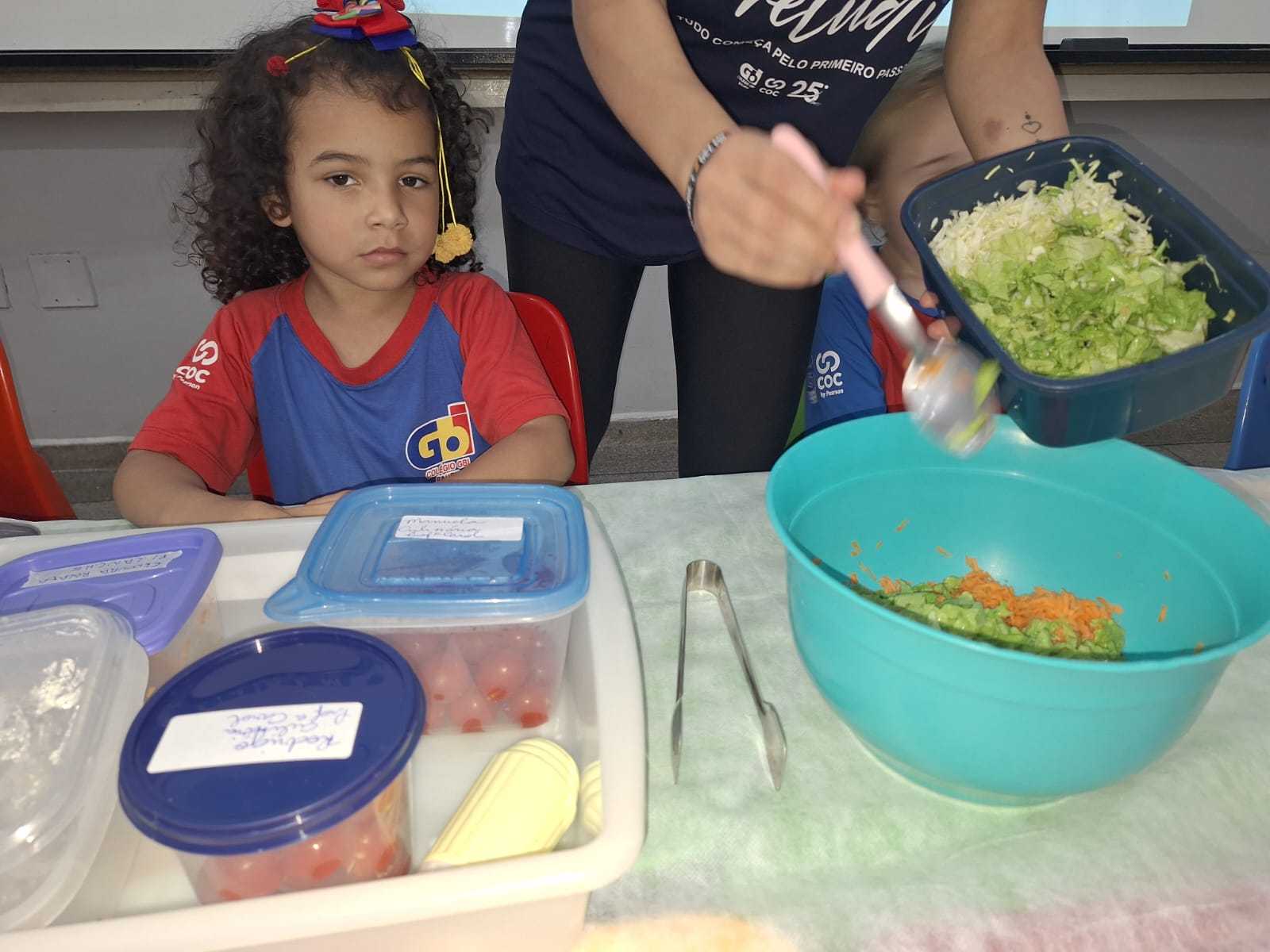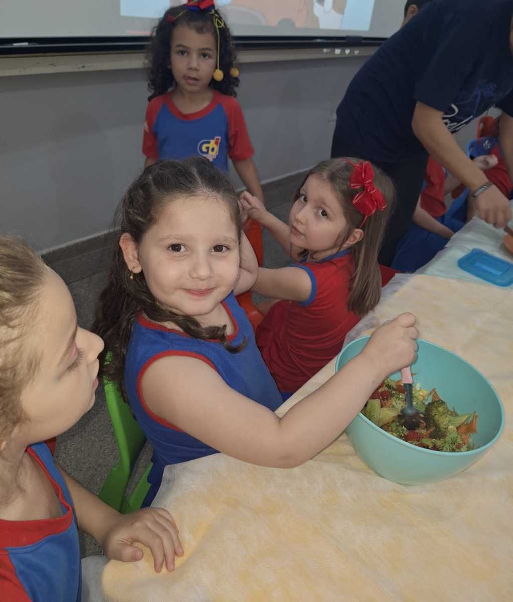 Foi uma explosão de cores e sabores, as crianças puderam observar, tocar e cheirar, misturamos todos os ingredientes em uma bacia (milho, alface, cenoura, brócolis e tomate cereja) acrescentamos orégano, azeite e sal e cada criança teve o seu momento de provar e saborear a nossa salada.