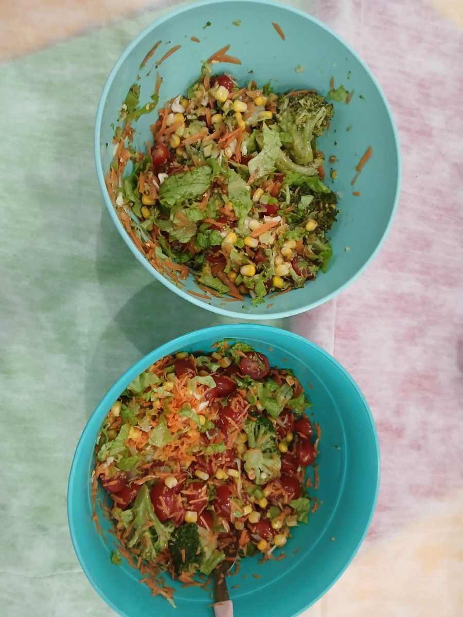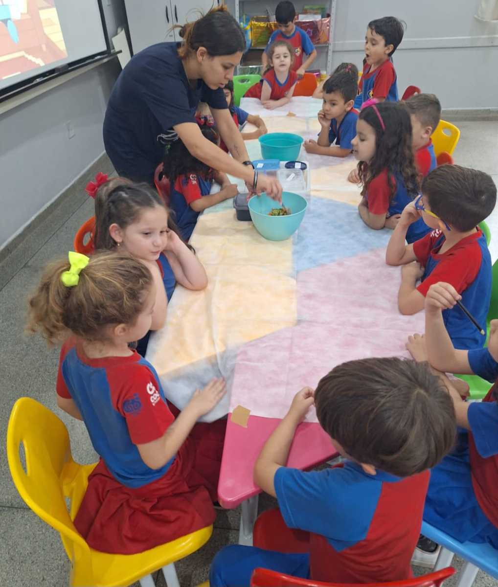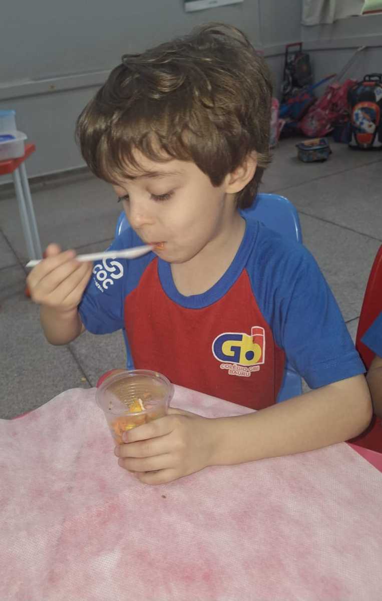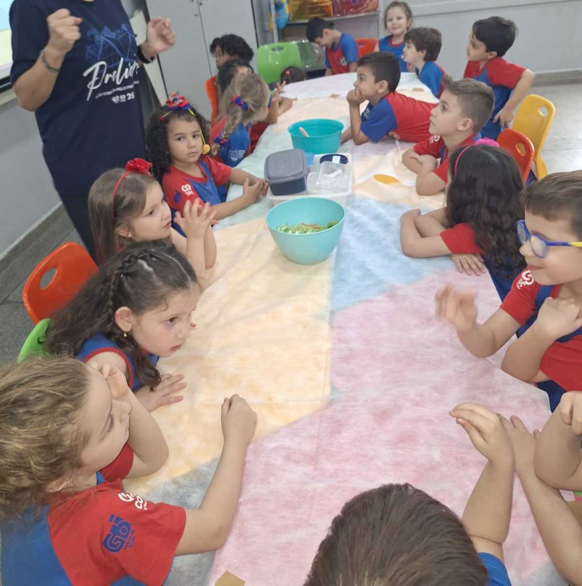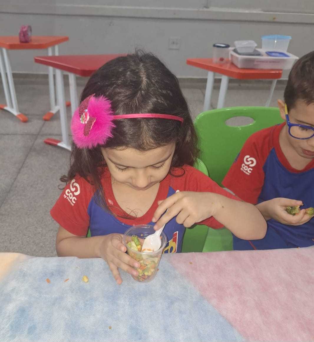Foi uma explosão de cores e sabores, as crianças puderam observar, tocar e cheirar, misturamos todos os ingredientes em uma bacia (milho, alface, cenoura, brócolis e tomate cereja) acrescentamos orégano, azeite e sal e cada criança teve o seu momento de provar e saborear a nossa salada.