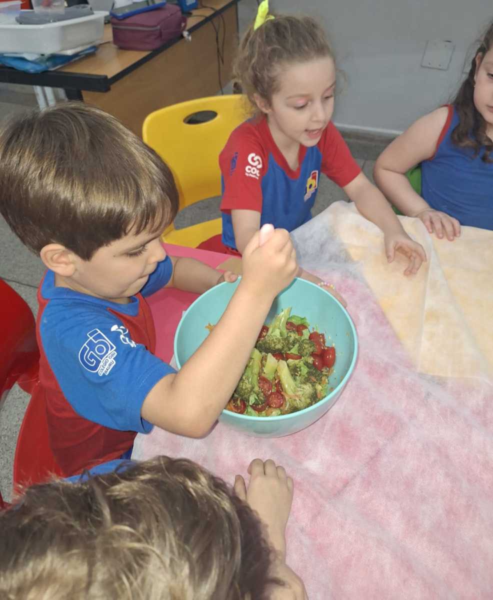 As crianças do Integral 2, trouxeram diversas “verduras e legumes” para montarmos uma linda salada primavera.