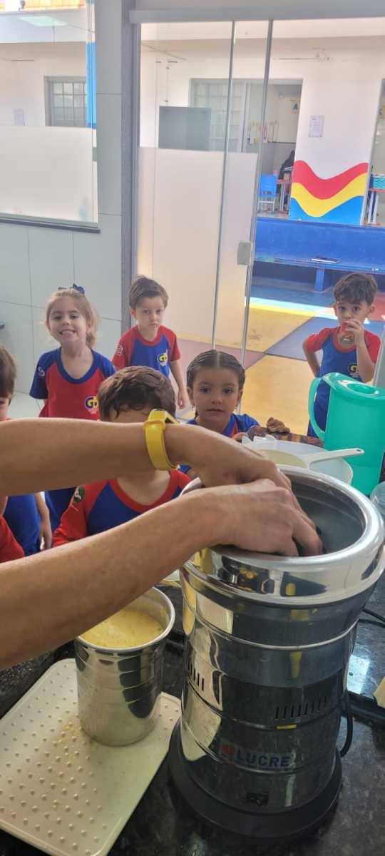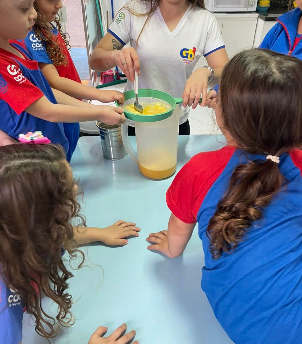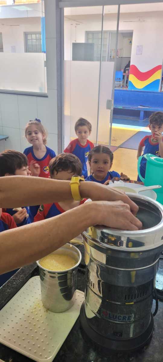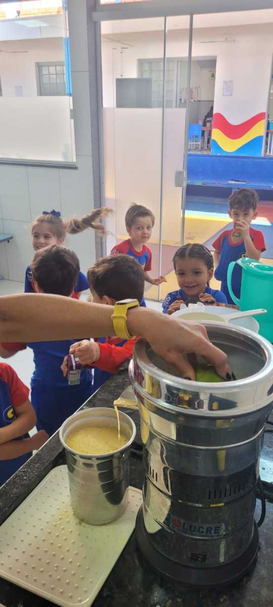 As crianças puderam explorar a fruta, sentir sua textura e aroma, observar a cor e participar do preparo do suco. Além de aprenderem de forma prática, também saborearam o resultado dessa experiência coletiva.