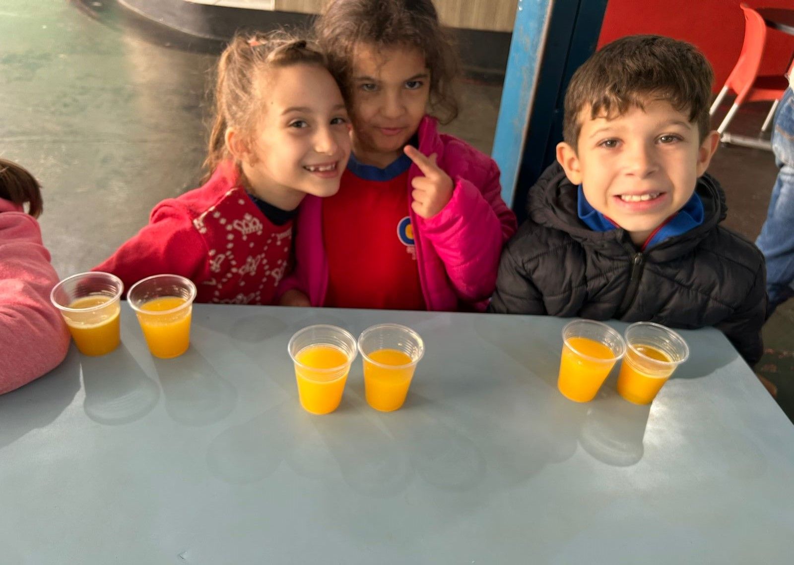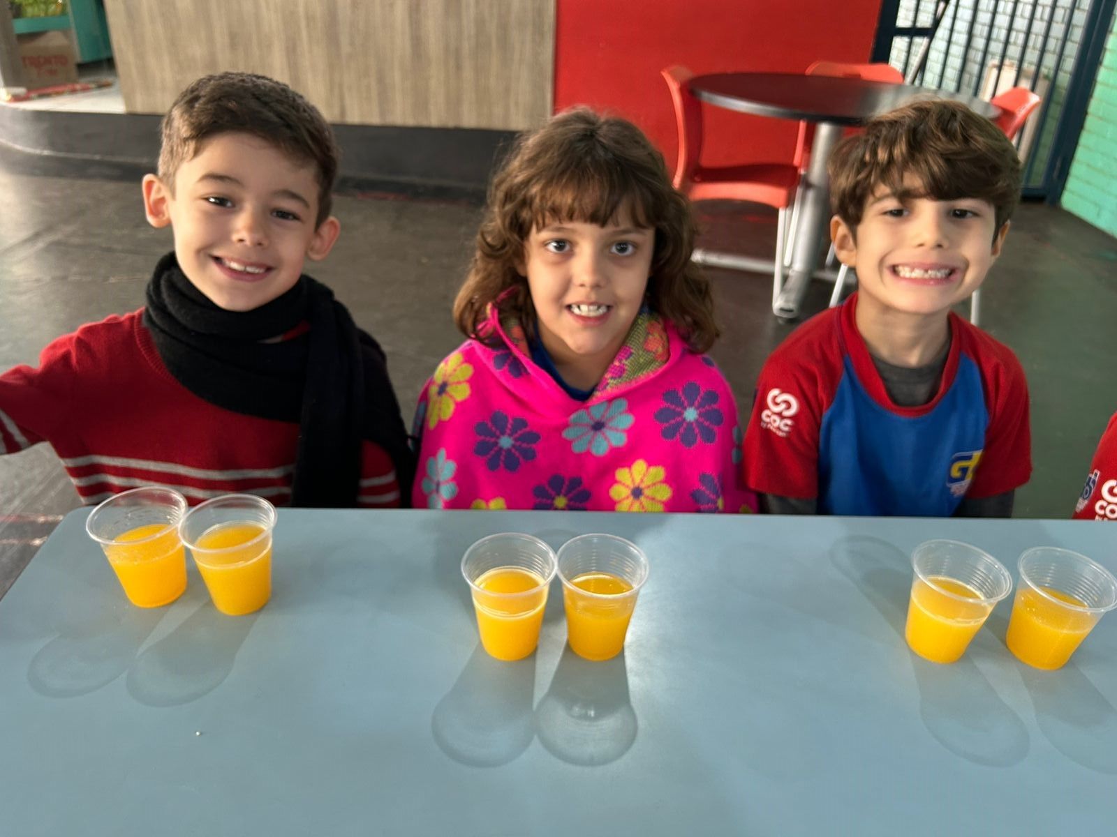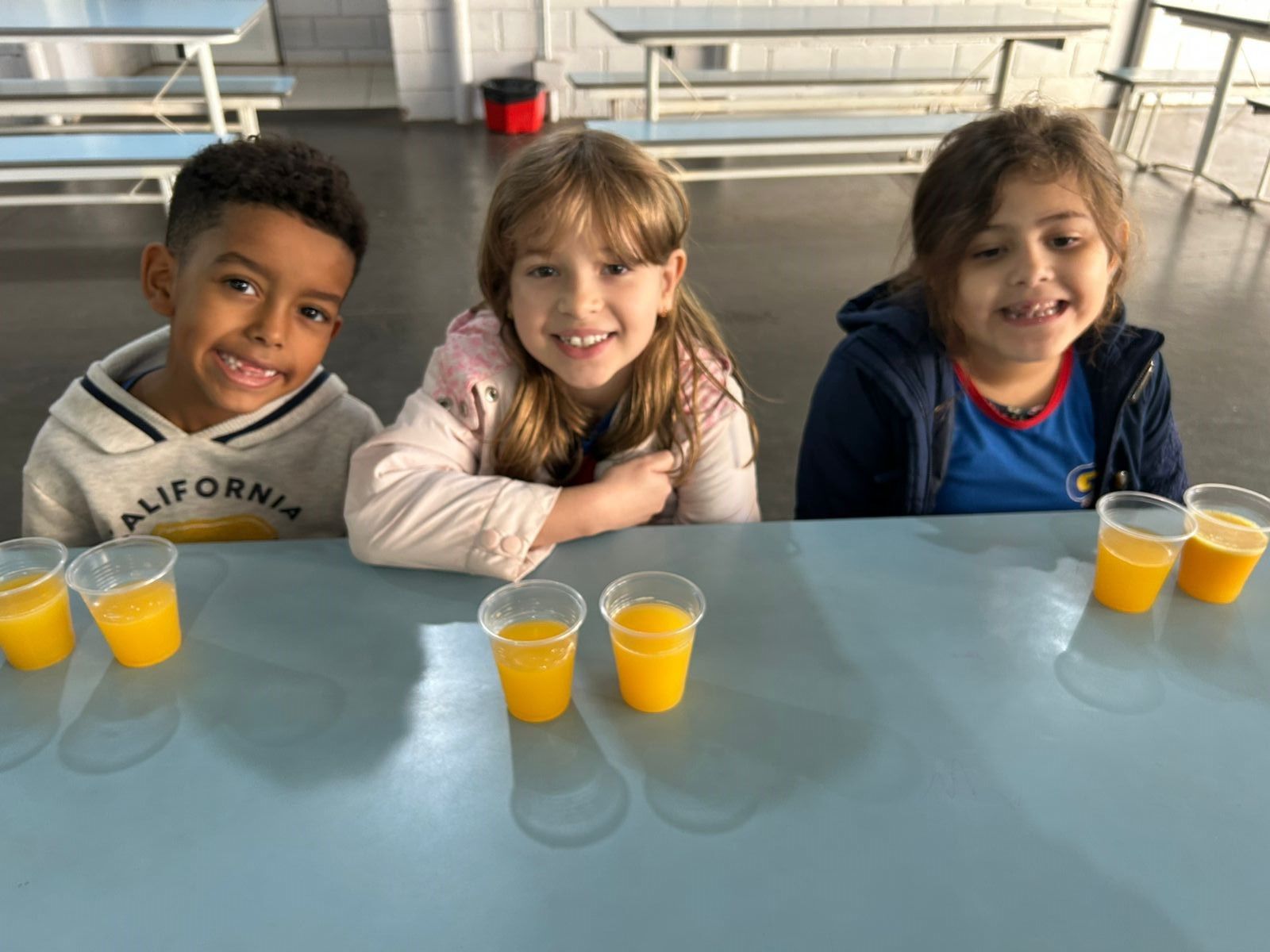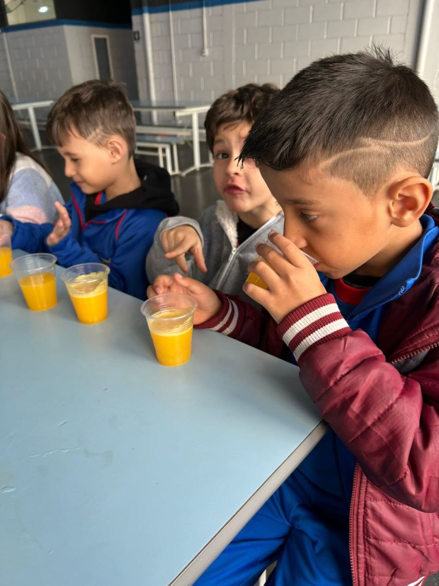 Ambos os sucos foram preparados junto com os alunos, para que também observassem as etapas e os ingredientes envolvidos em cada um. Foi um momento rico, divertido e de muito aprendizado! 🍊✨