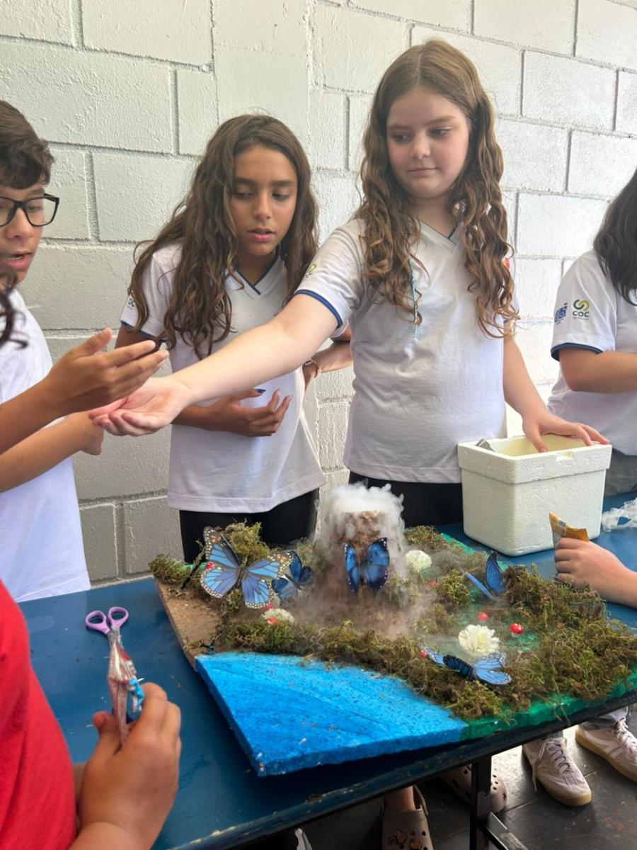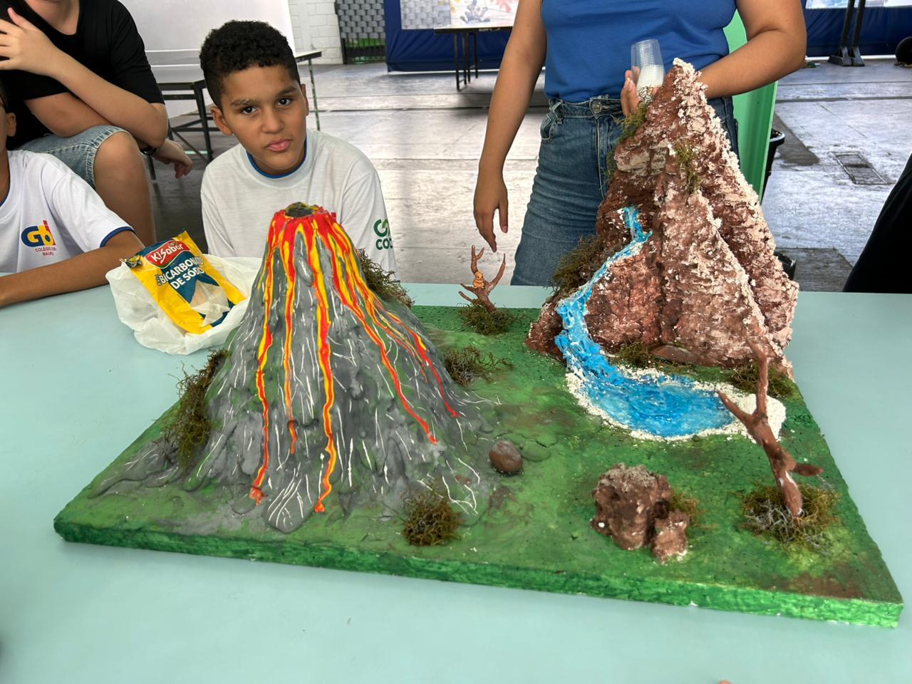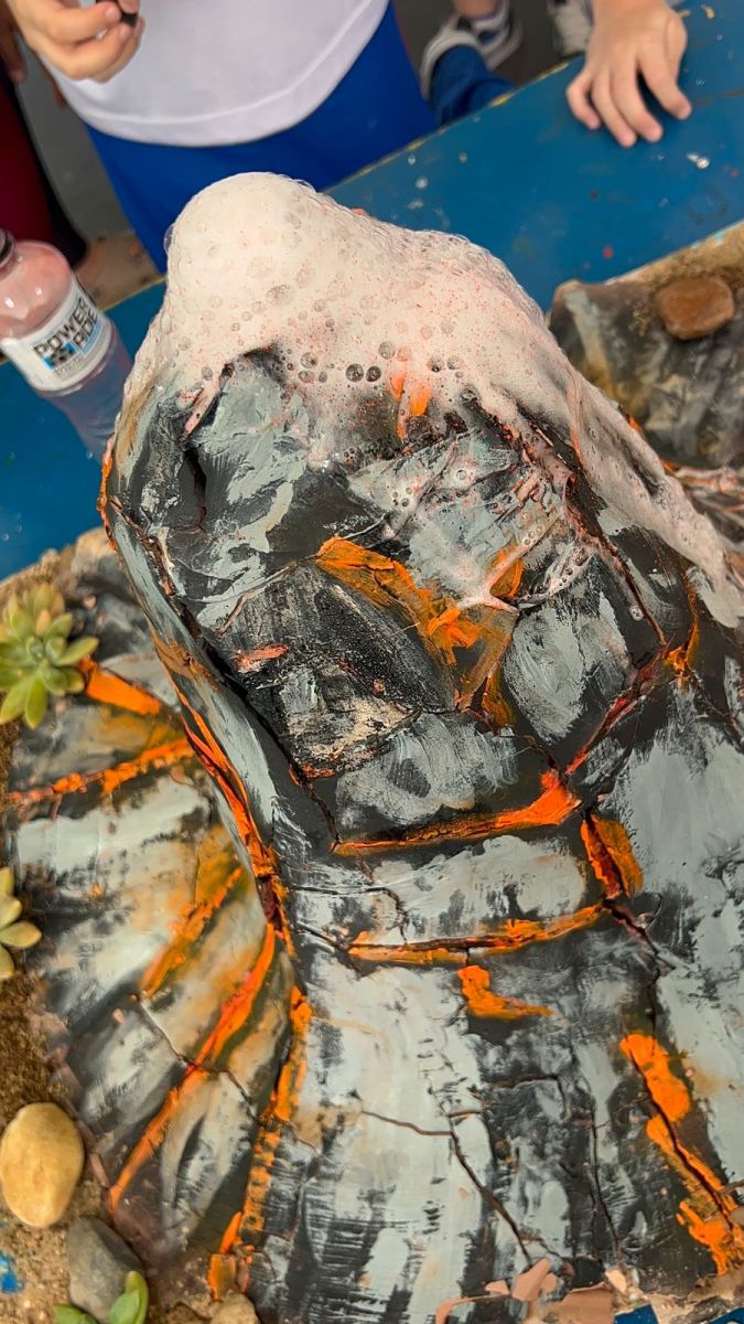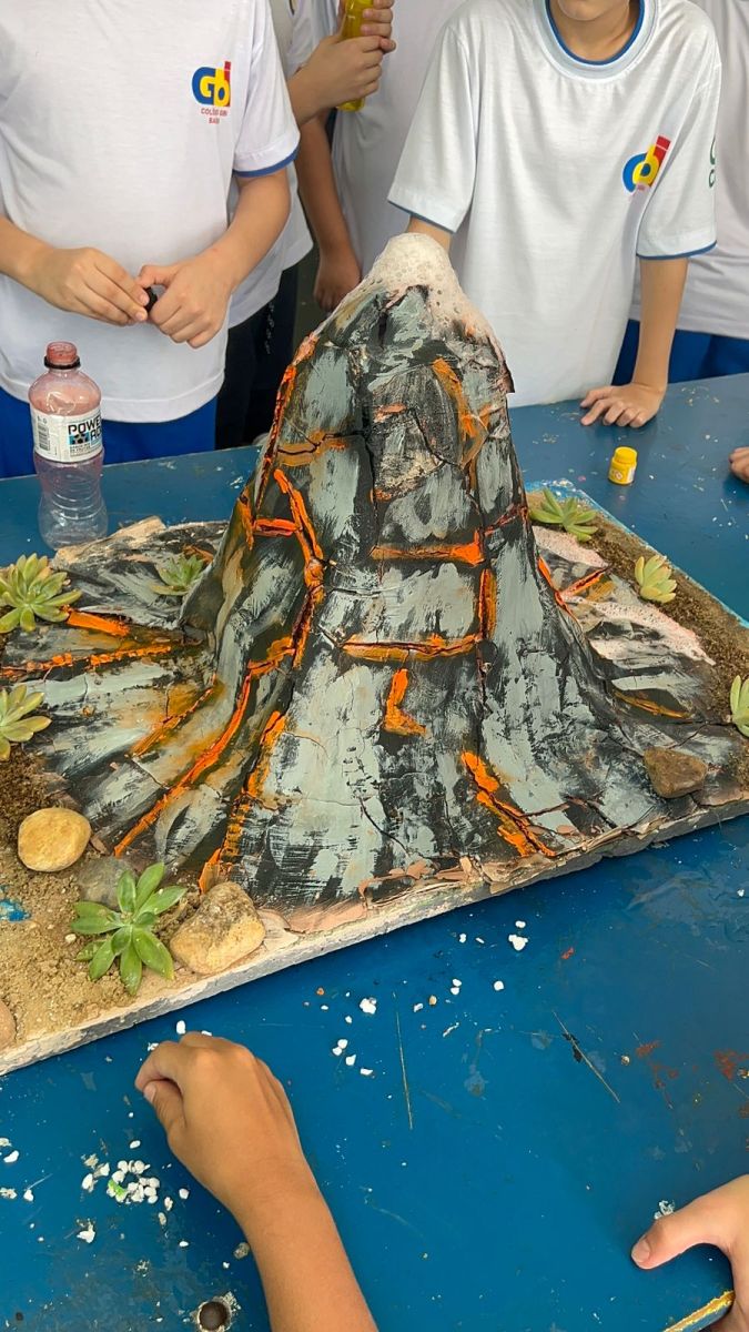 Os alunos construíram seus próprios modelos de vulcão e, por meio de uma reação química simples, simularam uma erupção, compreendendo melhor conceitos como transformação de substâncias e liberação de gases 🌋